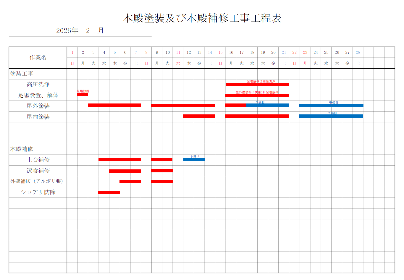 2026年2月中、遷座百年祭に向けての本殿の塗装及び補修工事を行います。工事中は足場の設置などでご迷惑をおかけします。末社を含めて参拝には支障がありませんので、通常通りお参りいただければ幸いです。